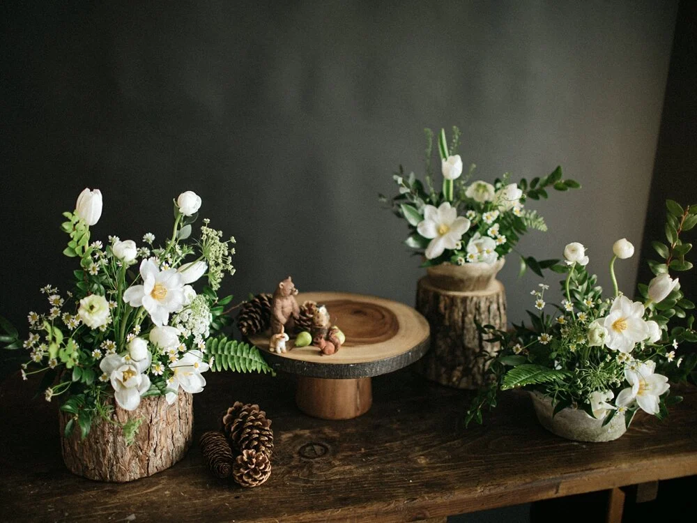2 trunk stand, 1 candle stick, 1 metal lantern, 1 candle stick, (3-4) woodland animal topper set, 3-5 pinecones for deco, 1 wooden basket, 1 bird house for arrangements